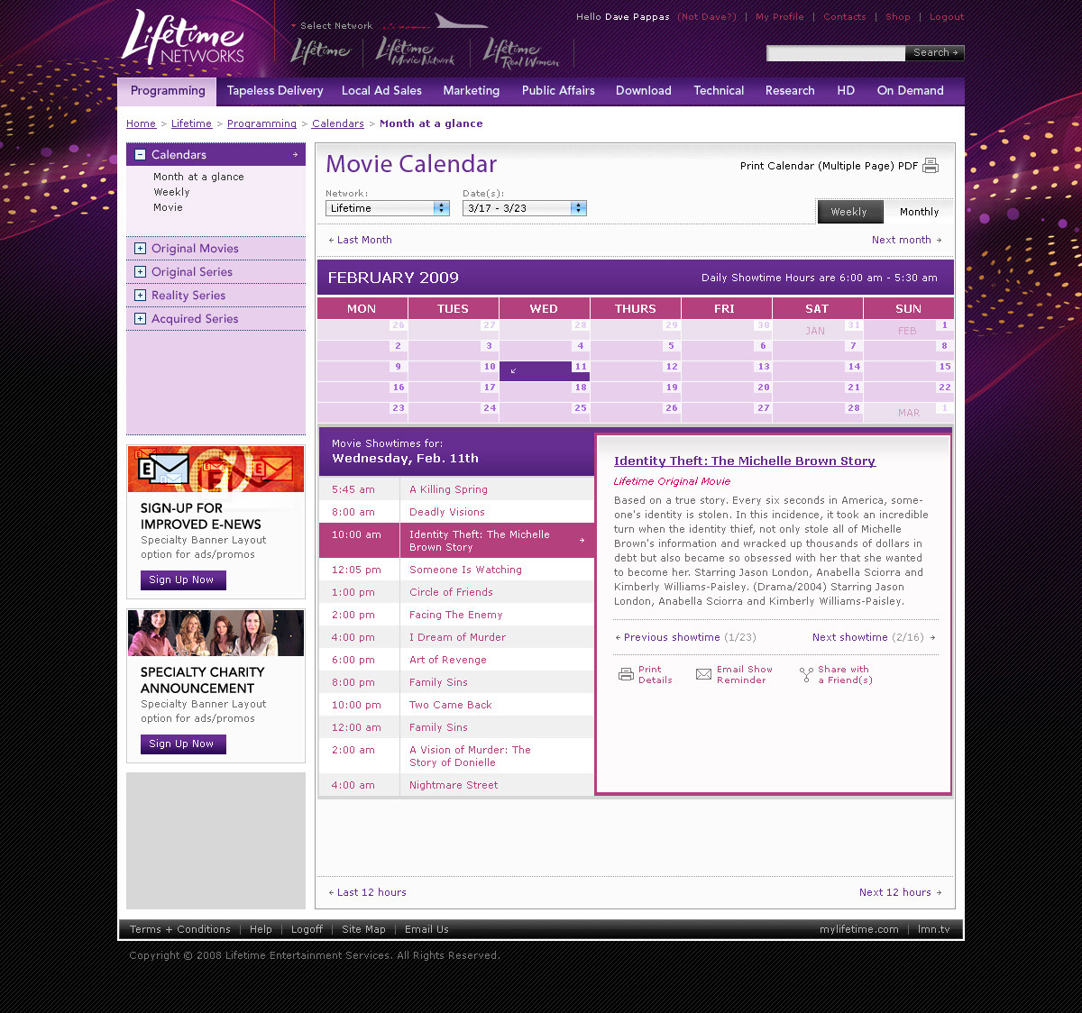 Lifetime Network intranet showcasing original movies, television series, reality series and other programming. Monthly weekly and daily calendar views for Lifetime affiliates to download, print and share.